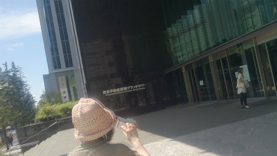 新宿の、会場のあるビル。と、まさみ氏。